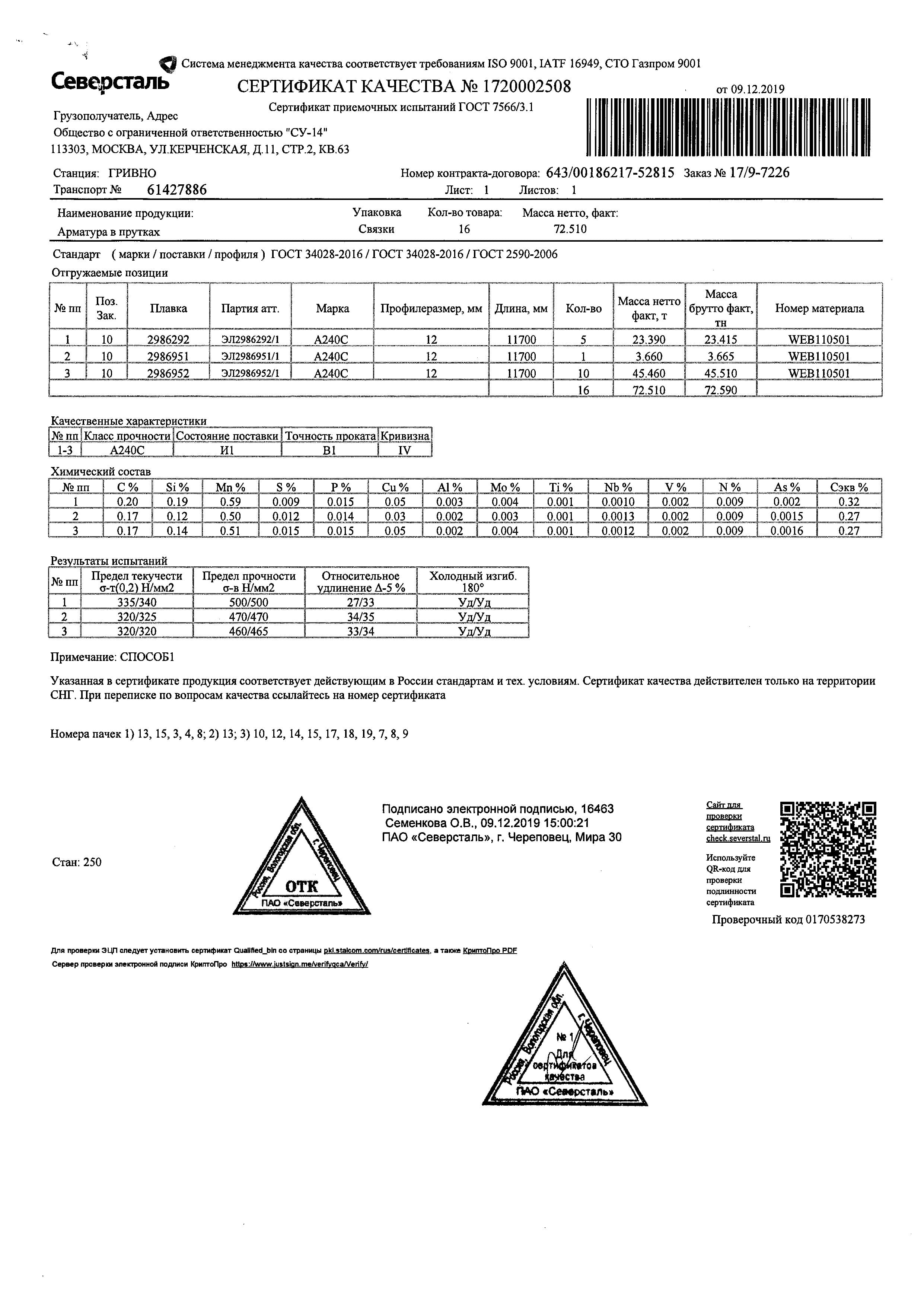 С каждой товарной позицией мы предоставляем все сертификаты и паспорта качества, а также товарно-транспортную накладную.